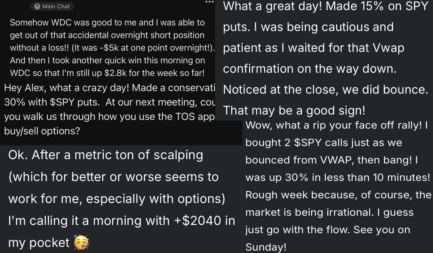 Real-Time Day Trading Stream everyday, complete day trading education, beginner to advanced strategies, weekly mentorship, private community of serious, like-minded traders, and direct access to your pro trading mentor to help you along the way.